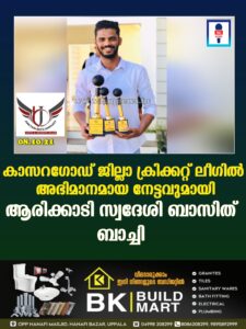 കാസറഗോഡ് ജില്ലാ ക്രിക്കറ്റ് ലീഗിൽ അഭിമാനമായ നേട്ടവുമായി ആരിക്കാടി സ്വദേശി ബാസിത് ബാച്ചി