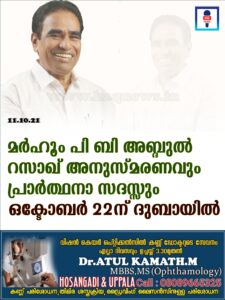 മർഹൂം പി ബി അബ്ദുൽ റസാഖ് അനുസ്മരണവും പ്രാർത്ഥനാ സദസ്സും ഒക്ടോബർ 22ന് ദുബായിൽ