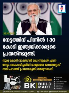 നേട്ടത്തിന് പിന്നിൽ 130 കോടി ഇന്ത്യയ്ക്കാരുടെ പ്രയത്നമുണ്ട്;നൂറു കോടി വാക്സിൻ ഡോസുകൾ എന്ന നേട്ടം കൈവരിച്ചതിൽ രാജ്യത്തെ ജനങ്ങളോട് നന്ദി പറഞ്ഞ് പ്രധാനമന്ത്രി നരേന്ദ്രമോദി