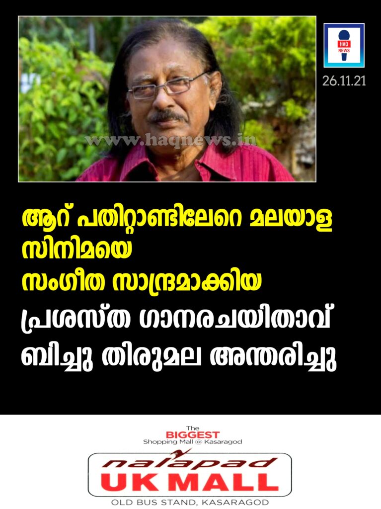 പ്രശസ്ത ഗാനരചയിതാവ് ബിച്ചു തിരുമല അന്തരിച്ചു