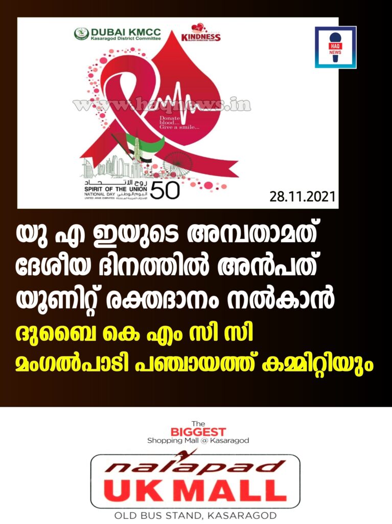 യു.എ.ഇയുടെ അമ്പതാമത് ദേശീയ ദിനത്തിൽ അൻപത് യൂണിറ്റ് രക്തദാനം നൽകാൻ ദുബൈ കെ എം സി സി മംഗൽപാടി പഞ്ചായത്ത് കമ്മിറ്റിയും