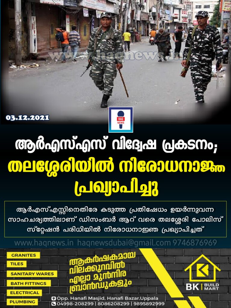 ആര്എസ്എസ് വിദ്വേഷ പ്രകടനം; തലശേരിയില് നിരോധനാജ്ഞ പ്രഖ്യാപിച്ചു