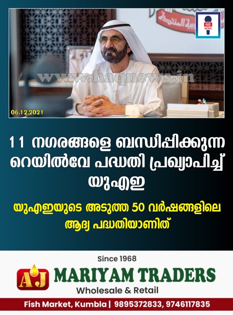 പുതിയ റെയില്വേ പദ്ധതി ആരംഭിക്കുമെന്ന് യുഎഇ പ്രഖ്യാപിച്ചു. ഡിസംബര് 2 ന് രാജ്യം അതിന്റെ സുവര്ണ ജൂബിലി ആഘോഷിച്ചതിന് ശേഷം യുഎഇയുടെ അടുത്ത 50 വര്ഷങ്ങളിലെ ആദ്യ പദ്ധതിയാണിത്. യുഎഇ വൈസ് പ്രസിഡന്റും പ്രധാനമന്ത്രിയും ദുബായ് ഭരണാധികാരിയുമായ ഹിസ് ഹൈനസ് ഷെയ്ഖ് മുഹമ്മദ് ബിന് റാഷിദ് അല് മക്തൂം ഇക്കാര്യം ട്വീറ്റ് ചെയ്തു. പദ്ധതിയില് യുഎഇയിലെ 11 നഗരങ്ങളെയും പ്രദേശങ്ങളെയും ബന്ധിപ്പിക്കുകയും പ്രതിവര്ഷം 36.5 ദശലക്ഷത്തിലധികം യാത്രക്കാരെ സൗകര്യമൊരുക്കുകയും ചെയ്യുമെന്ന് ട്വീറ്റ് ചെയ്ത വീഡിയോയില് പറയുന്നു.”ഈ പദ്ധതി പ്രകാരം ഞങ്ങളുടെ ദേശീയ മുന്ഗണന സമ്പദ്വ്യവസ്ഥയും വികസനവുമാണ് എന്ന് ഞങ്ങള് ഊന്നിപ്പറയുകയും യുഎഇയെ ഒരു സാമ്പത്തിക ലക്ഷ്യസ്ഥാനമായി മാറ്റുകയും ചെയ്യും. ഈ പദ്ധതിയിലൂടെ യുഎഇയുടെ പുതിയ 50 വര്ഷം ആരംഭിക്കുന്നതില് ഞങ്ങള് അഭിമാനിക്കുന്നു’ ഷെയ്ഖ് മുഹമ്മദ് ട്വീറ്റ് ചെയ്തു.