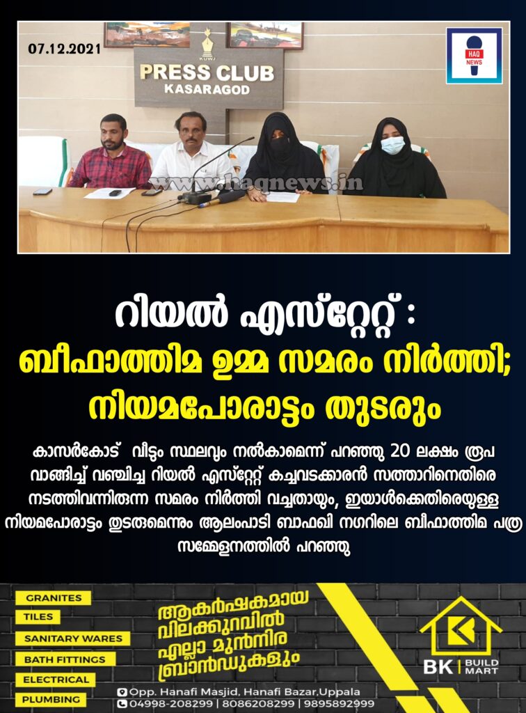 കാസര്കോട് : വീടും സ്ഥലവും നല്കാമെന്ന് പറഞ്ഞു 20 ലക്ഷം രൂപ വാങ്ങിച്ച് വഞ്ചിച്ച റിയല് എസ്റ്റേറ്റ് കച്ചവടക്കാരന് സത്താറിനെതിരെ നടത്തിവന്നിരുന്ന സമരം നിര്ത്തി വച്ചതായും, ഇയാള്ക്കെതിരെയുള്ള നിയമപോരാട്ടം തുടരുമെന്നും ആലംപാടി ബാഫഖി നഗറിലെ ബീഫാത്തിമ പത്ര സമ്മേളനത്തില് പറഞ്ഞു.