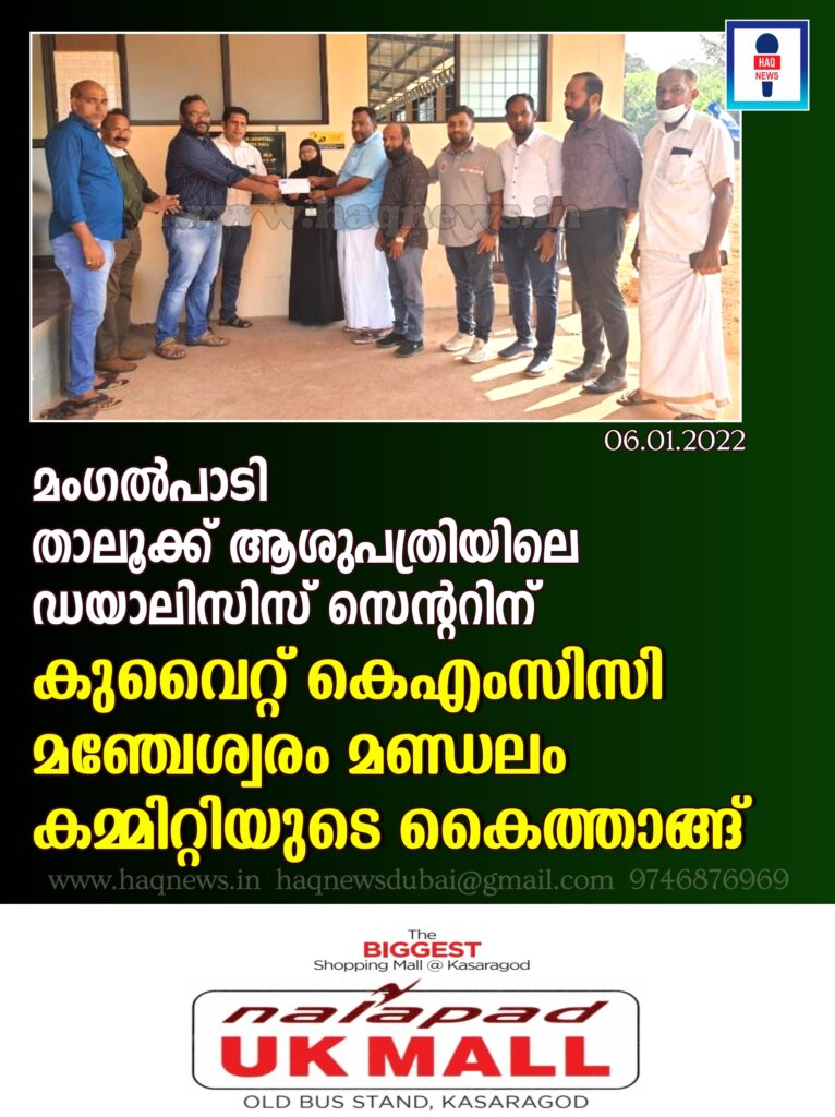 മംഗൽപാടി താലൂക്ക് ആശുപത്രിയിലെ ഡയാലിസിസ് സെന്ററിന് കുവൈറ്റ് കെഎംസിസി മഞ്ചേശ്വരം മണ്ഡലം കമ്മിറ്റിയുടെ കൈത്താങ്ങ്