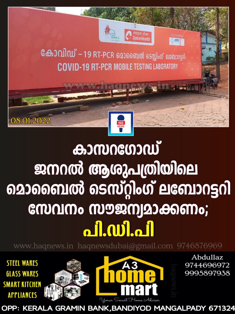 കാസറഗോഡ് ജനറല് ആശുപത്രിയിലെ മൊബൈല് ടെസ്റ്റിംഗ് ലബോറട്ടറി സേവനം സൗജന്യമാക്കണം;പി.ഡി.പി