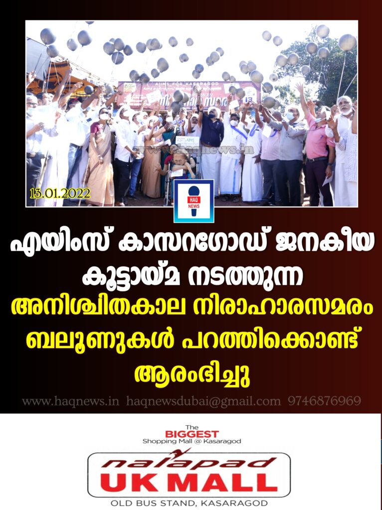 എയിംസ് കാസർഗോഡ് ജനകീയ കൂട്ടായ്മ നടത്തുന്ന അനിശ്ചിതകാല നിരാഹാരസമരം ബലൂണുകൾ പറത്തിക്കൊണ്ട് ആരംഭിച്ചു