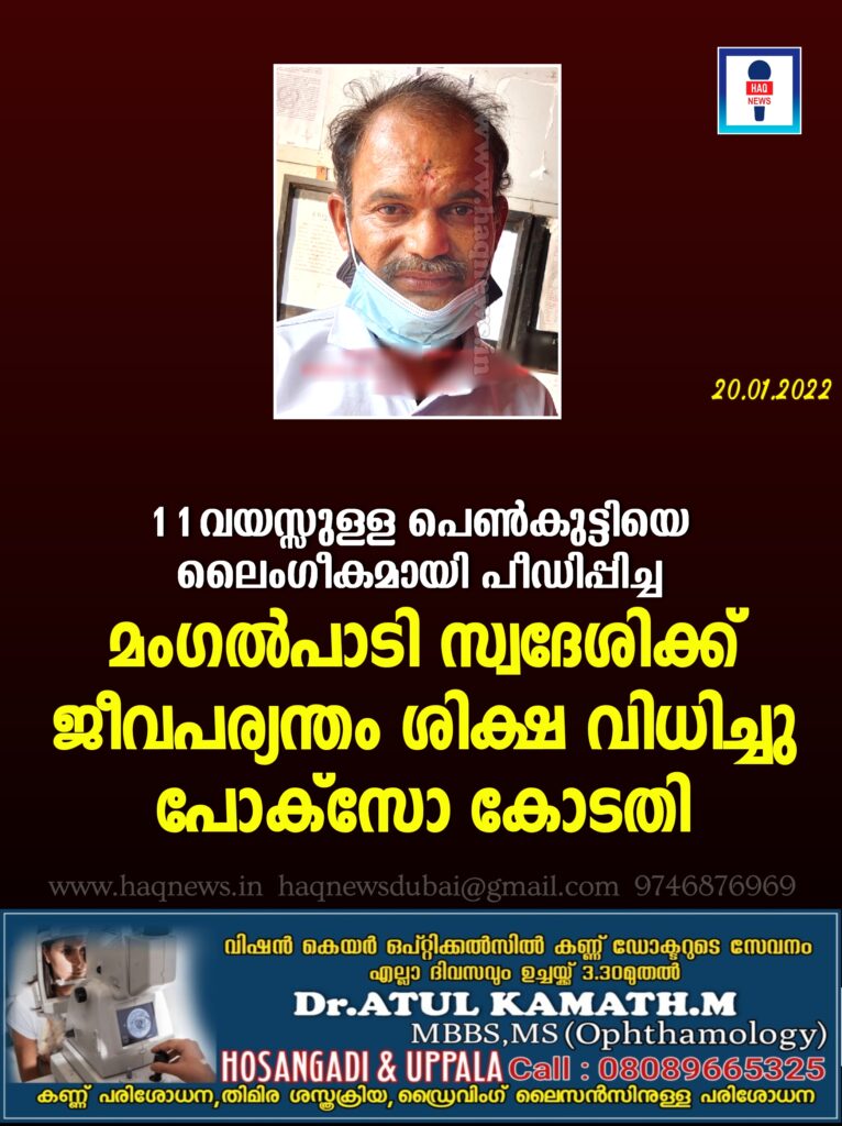11വയസ്സുള്ള പെൺകുട്ടിയെ ലൈംഗീകമായി പീഡിപ്പിച്ച മംഗൽപാടി സ്വദേശിക്ക് ജീവപര്യന്തം ശിക്ഷ വിധിച്ചു പോക്സോ കോടതി