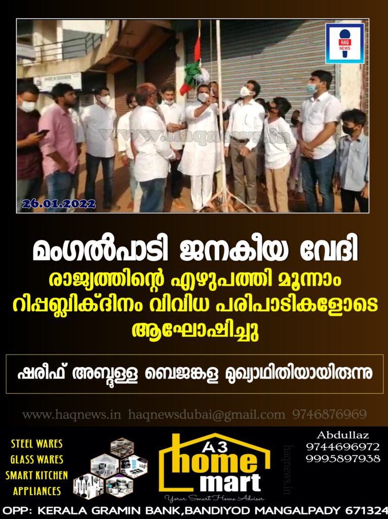 ഐക്യത്തിനും വേണ്ടി ശബ്‌ദിക്കുന്ന ദിശബോധമുള്ളൊരു തലമുറയെ സൃഷ്ടിക്കാൻ നാം കൈകോർക്കണം എന്ന് മംഗൽപാടി ജനകീയ വേദിയുടെ റിപബ്ലിക് ദിന സന്ദേശം നൽകി, ചടങ്ങിൽ സിദ്ധീക് കൈകമ്പ ആദ്യക്ഷത വഹിച്ചു,