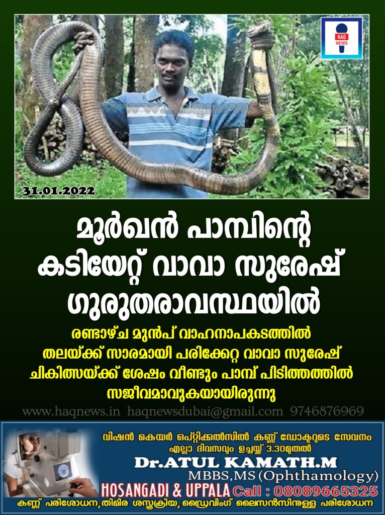 മൂ‍ർഖൻ പാമ്പിൻ്റെ കടിയേറ്റ് വാവാ സുരേഷ് ​ഗുരുതരാവസ്ഥയിൽ