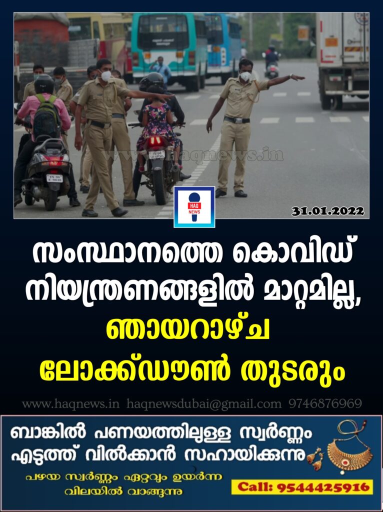 സംസ്ഥാനത്തെ കൊവിഡ് നിയന്ത്രണങ്ങളിൽ മാറ്റമില്ല, ഞായറാഴ്ച ലോക്ക്ഡൗൺ തുടരും