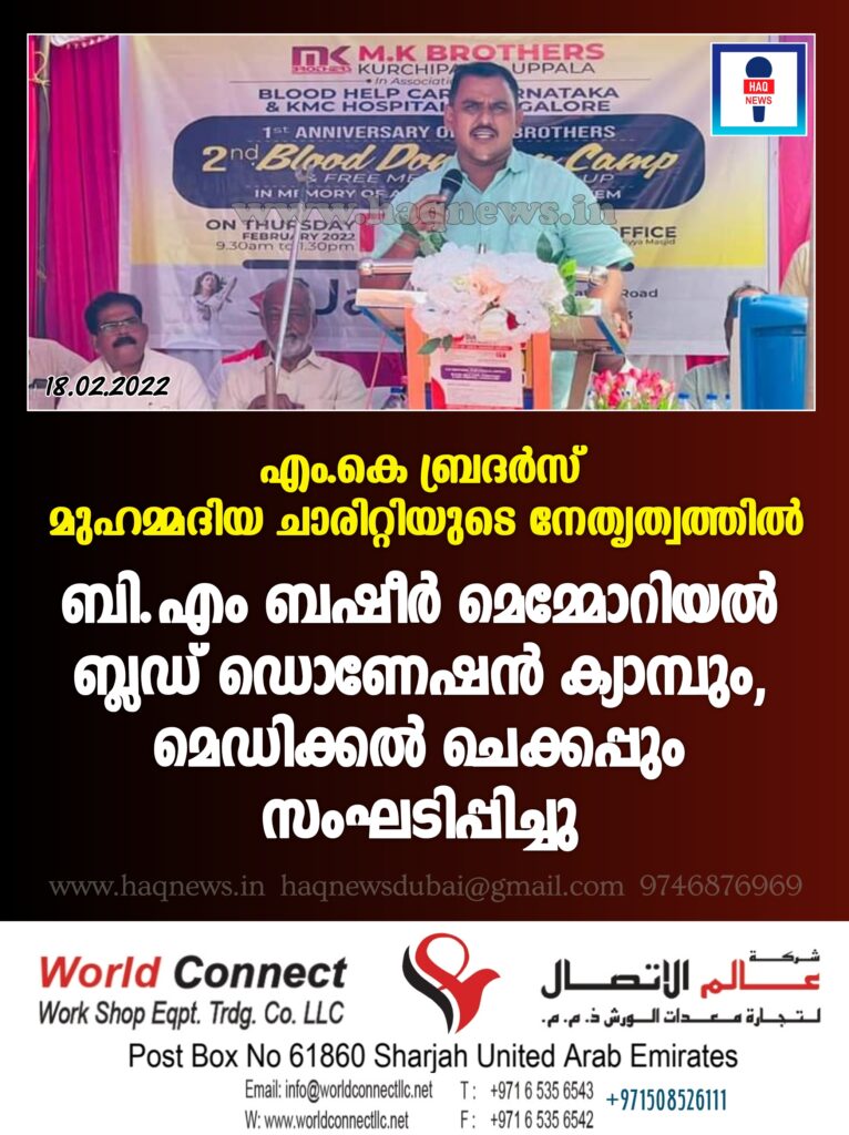 മുഹമ്മദിയ ചാരിറ്റിയുടെ നേതൃത്വത്തിൽ ബി.എം ബഷീർ മെമ്മോറിയൽ ബ്ലഡ് ഡൊണേഷൻ ക്യാമ്പും,മെഡിക്കൽ ചെക്കപ്പും സംഘടിപ്പിച്ചു