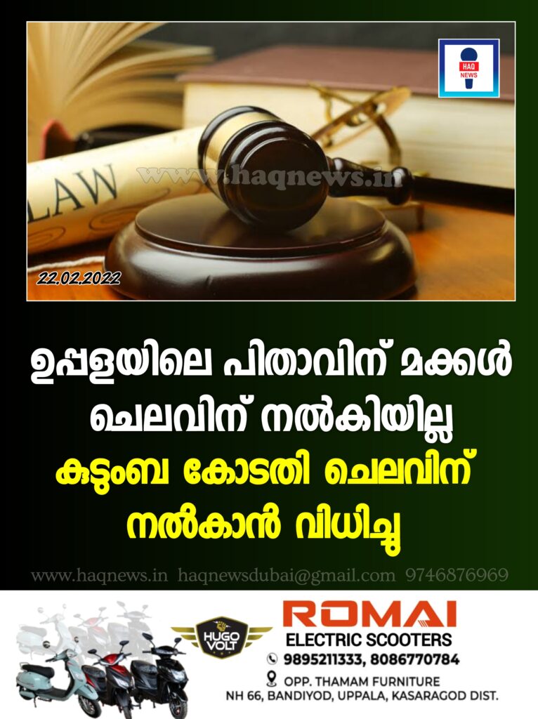 ഉപ്പള: അസുഖ ബാധിതനും വയോജകനുമായ പിതാവിന് മക്കൾ ചെലവിന് നൽകിയില്ല.14000/- രൂപ പ്രതിമാസം നൽകാൻ കുടുംബ കോടതി വിധിച്ചു. ഉപ്പള കസായി ഗല്ലിയിൽ താമസിക്കുന്ന ഷെയ്ഖ് അഷ്റഫ് ഹുസൈൻ ആണ് മക്കളായ ഷെയ്ഖ് അമീൻ ഹുസൈൻ ,ഹഫ്സ ബാനു (W/O) ആകിൽ (s/o Saik Abdin Asia mehandi, Hanafi bazar , Uppala) എന്നിവർക്കെതിരെയാണ് കാസർഗോഡ് കുടുംബ കോടതിയിൽ പരാതി സമർപ്പിച്ചത് 2 മക്കളും കൂടി പ്രതിമാസം 14000 രൂപയും 2019 നവംബർ മാസം മുതൽ 2020 നവംബർ വരെ 24 മാസത്തെ തുക 336000 രൂപ 3 മാസത്തിനകം കോടതിയിൽ കെട്ടിവെക്കാനും ഉത്തരവായിട്ടുണ്ട്.