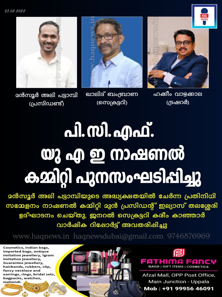 അജ്മാൻ : പി. സി. എഫ്. യു. എ. ഇ. നാഷണൽ കമ്മിറ്റിയുടെ നേതൃത്വത്തിൽ 2022-2023 വർഷത്തേക്കുള്ള എമിറേറ്റ്സ് കമ്മിറ്റികളുടെ പുനഃസംഘടന പൂർത്തീകരിക്കുകയും നാഷണൽ കമ്മിറ്റി നിലവിൽ വരികയും ചെയ്തു. ജനുവരി 16ന് ആരംഭിച്ച് ഒരു മാസക്കാലം നീണ്ടുനിന്ന സംഘടനാ തിരഞ്ഞെടുപ്പിൽ