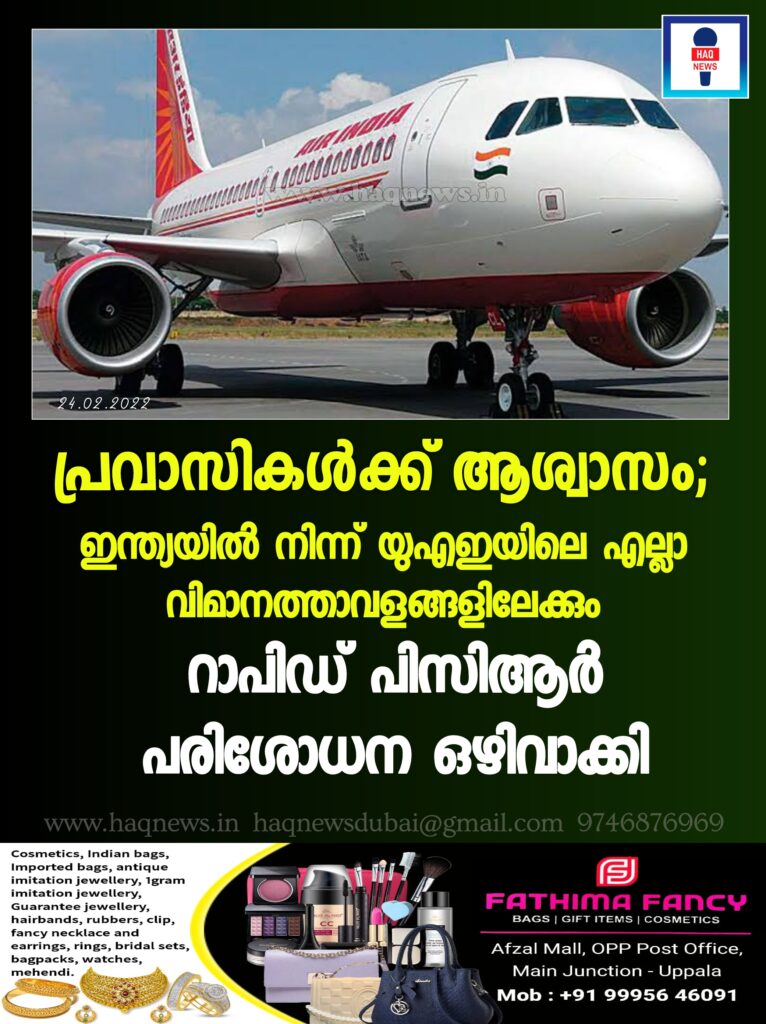 യുഎഇ പ്രവാസികൾക്ക് ആശ്വാസം; യുഎഇയിലെ എല്ലാ വിമാനത്താവളങ്ങളിലേക്കും റാപിഡ് പിസിആര് പരിശോധന ഒഴിവാക്കി