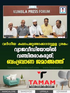 കുമ്പള: മൂന്നു വർഷങ്ങൾക്ക് മുൻപ് സാമൂഹിക മാധ്യമങ്ങളിൽ പ്രചരിച്ചിരുന്ന വീഡിയോ തീയതി മാറ്റി വീണ്ടും പ്രചരിപ്പിക്കുന്നവർക്കെതിരെ നടപടിയാവശ്യപ്പെട്ട് ബംബ്രാണ മുസ് ലിം ജമാഅത്ത് കമ്മിറ്റി. നാട്ടിലെ സമാധാന അന്തരീക്ഷം തകർക്കാൻ ശ്രമിക്കുന്നവർക്കെതിരെ ശക്തമായ നടപടിയുണ്ടാവണം. മുൻപ് നടന്ന സംഭവം ഇരു വിഭാഗങ്ങളും രമ്യമായി പരിഹരിച്ചതാണ്. വർഗീയ കലാപമുണ്ടാക്കാനുള്ള സംഘടിതമായ ശ്രമം ഇതിനു പിന്നിലുണ്ടെന്ന് സംശയിക്കുന്നു. കണിപുര ക്ഷേത്രത്തിൽ ഉത്സവം നടക്കാനിരിക്കെയാണ് ഇത്തരത്തിൽ വ്യാജ പ്രചരണമെന്നതിനാൽ ജമാ അത്ത് ഗൗരവത്തോടെയാണ് പ്രശ്നത്തെ കാണുന്നത്.