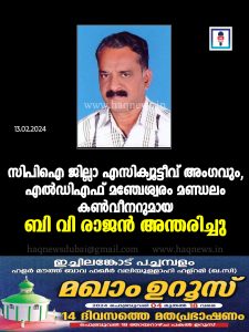 സിപിഐ കാസറഗോഡ് ജില്ലാ എസിക്യൂട്ടീവ് അംഗവും, എൽഡിഎഫ് മഞ്ചേശ്വരം മണ്ഡലം കൺവീനറുമായ ബി വി രാജൻ അന്തരിച്ചു
