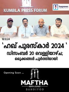 ഉപ്പള: കഴിഞ്ഞ 5വർഷങ്ങളായി ഓൺലൈൻ മീഡിയ രംഗത്ത് നിറഞ്ഞ് നിൽക്കുന്ന ജില്ലയിലെ തന്നെ പോർട്ടലുകളിലൊന്നായ “ഹഖ് ന്യൂസ്” അഞ്ചാം വാർഷികത്തിന്റെ ഭാഗമായി സംഘടിപ്പിക്കുന്ന ” ഹഖ് പുരസ്ക്കാർ 2024″ ഡിസംബർ 20 വെള്ളിയാഴ്ച വൈകുന്നേരം നടത്താൻ തീരുമാനിച്ചിരിക്കുന്നു. ബന്തിയോട് ഡി.എം ആശുപത്രിയ്ക്കടുത്ത് സ്തിഥി ചെയ്യുന്ന “ജസ്ബ മിനി കൺവെൻഷൻ ഹാൾ” ൽ വെച്ച് വൈകുന്നേരം 4മണിക്ക് നടക്കുന്ന ചടങ്ങ് പ്രമുഖ വ്യവസായ പ്രമുഖൻ ലത്തീഫ് ഉപ്പളഗേറ്റ് ഉദ്ഘാടനം നിർവഹിക്കും.